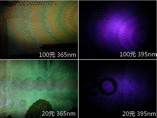 365nm的可以照出一些395nm照不出的熒光,比如人-民-幣背面的熒光