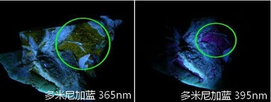 365nm照出來的光基本不含紫色,不影響判斷。395nm的紫色很強,有時候會影響判斷。