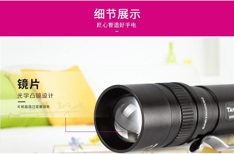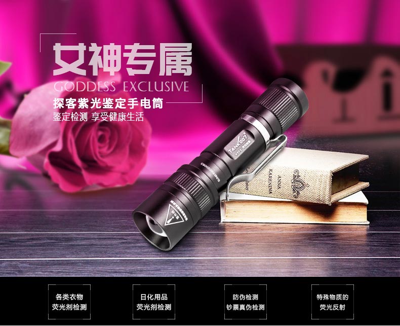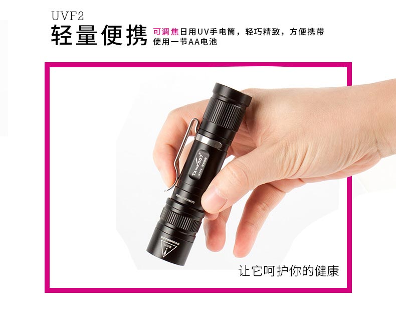 TANK007探客UVF2便攜式可調(diào)焦紫外線手電筒1.UV F2是一款便攜式調(diào)焦UV紫光手電筒,使用一節(jié)AA電池2.配合筆夾可以方便掛于口袋隨身攜帶3.UV手電應用領(lǐng)域如下:各類衣物、日化用品的熒光劑...