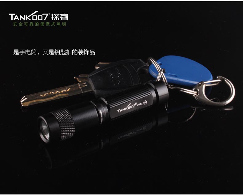 TANK007探客UV01熒光劑檢測365nm紫外線手電筒:1.UV01是一款便攜式迷你日用UV手電筒,使用一節(jié)AAA電池2.配合鑰匙扣可以方便掛于鑰匙串上隨身攜帶