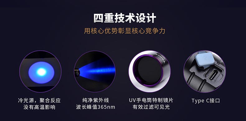 3.UV手電筒特制鏡片,有效過濾可見光,降低可見光干擾