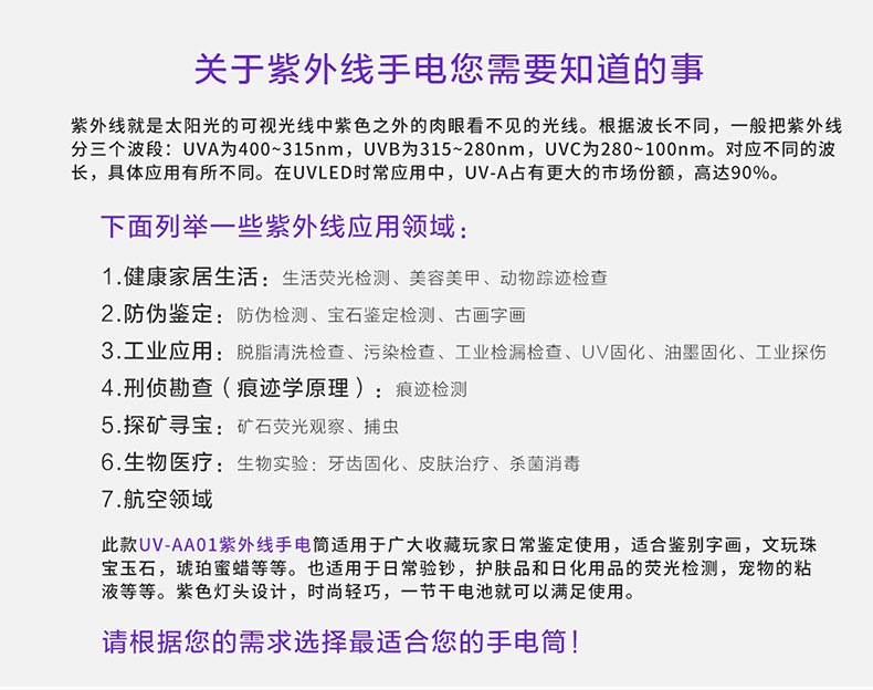 1.AA01是一款便攜式迷你便攜的365nm檢測(cè)手電