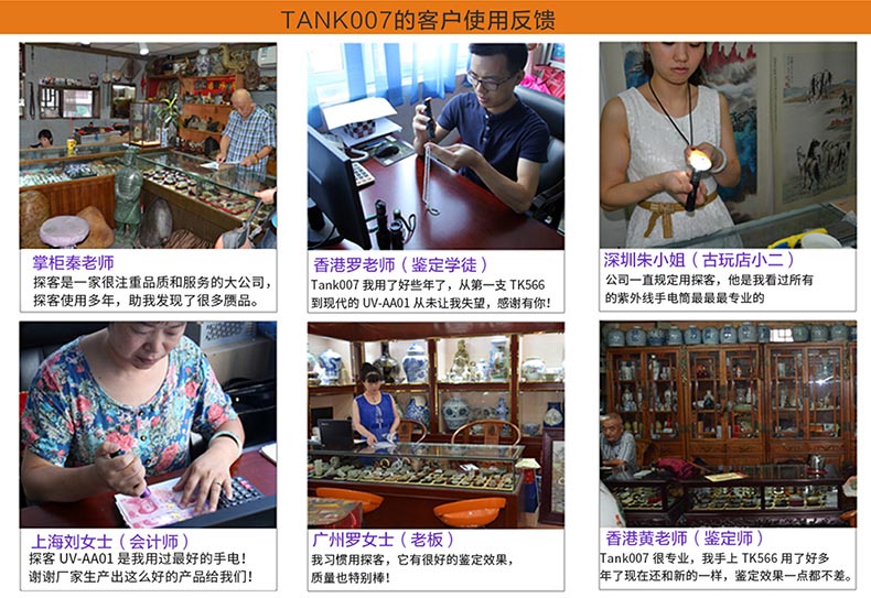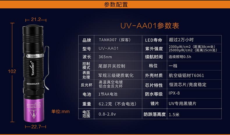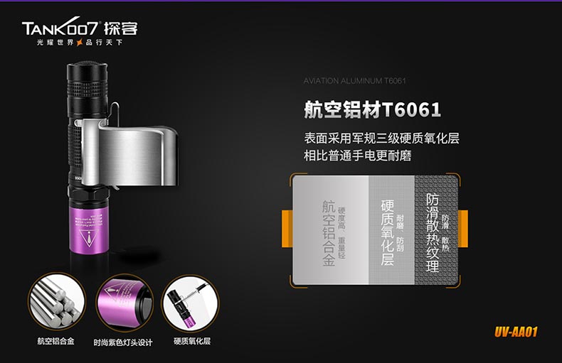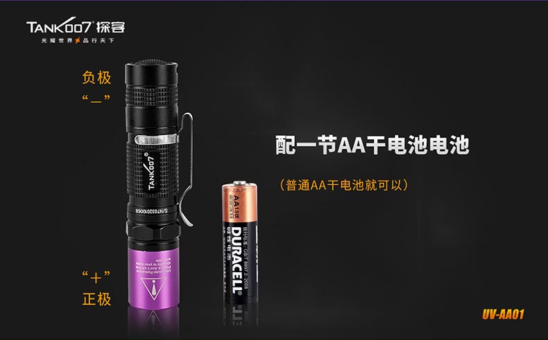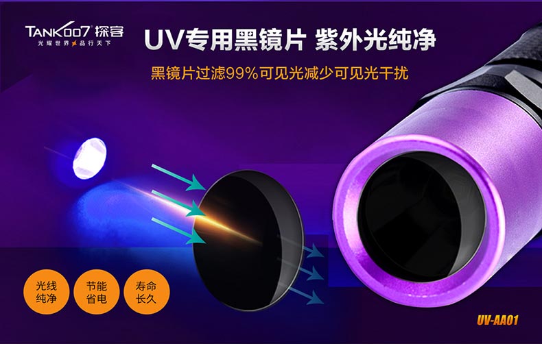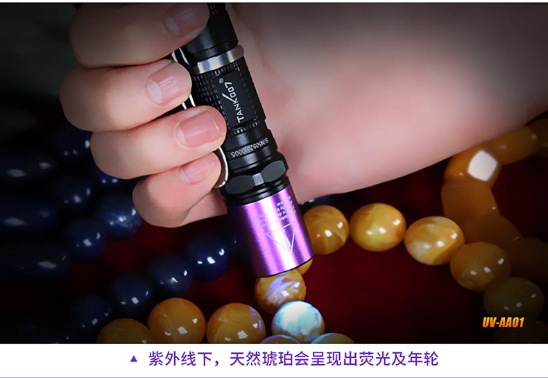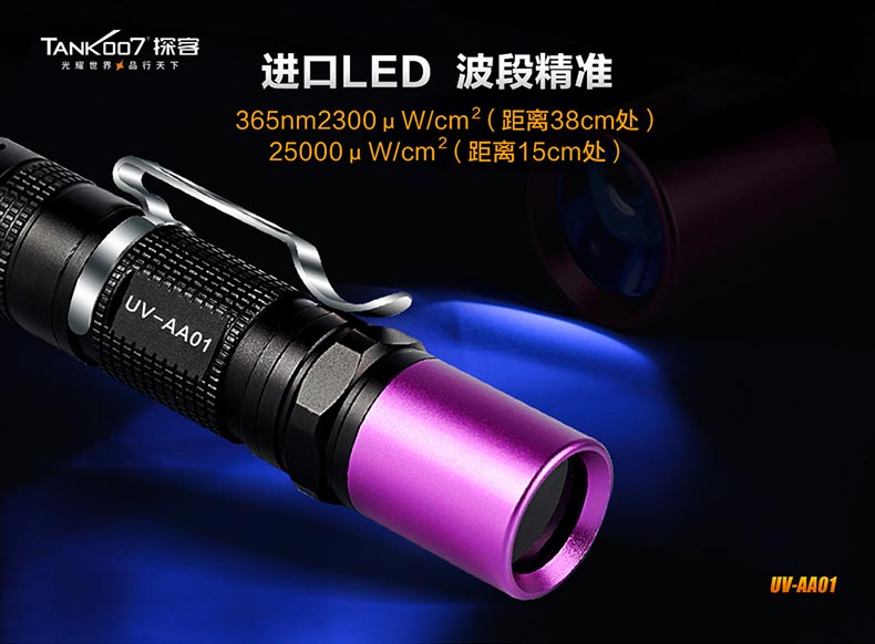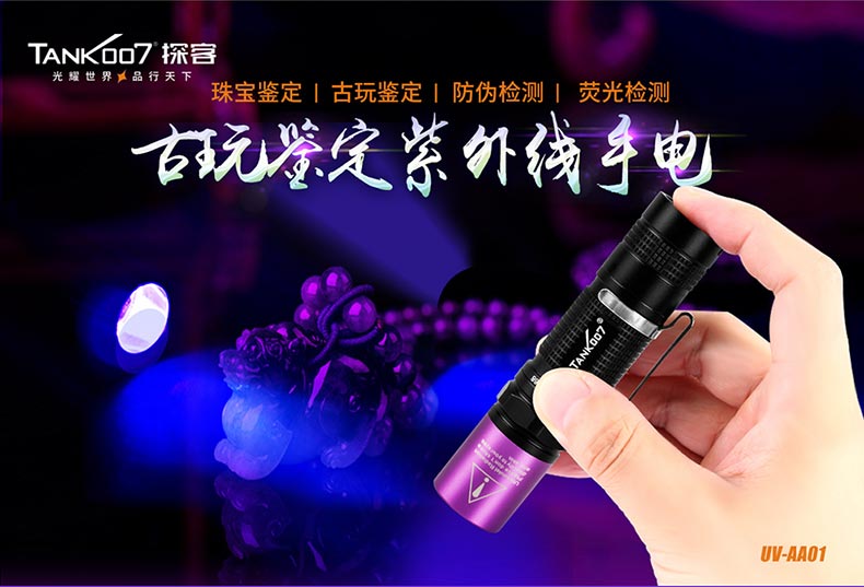TANK007探客UV-AA01熒光檢測(cè)文玩珠寶鑒定365nm紫外線手電筒:是一款便攜式迷你便攜的365nm紫外線燈手電筒,適用于文玩珠寶鑒定,痕跡檢測(cè),字畫(huà)票據(jù)/玉石鑒定檢測(cè)