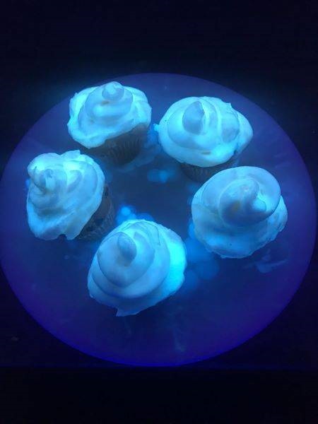在制作紙杯蛋糕的過程中,糖霜的制作過程是非常迅速的,但容易發(fā)生熒光的果凍卻非常耗時(shí)。因此在使用紫外線手電筒照射該不部位時(shí),請?zhí)崆皽?zhǔn)備好果凍的處理。當(dāng)我們在蛋糕上置入準(zhǔn)備好的果凍后,在紫光燈照射下可以看到熒光反應(yīng),盡管效果不是很明顯,但已經(jīng)讓我們非常驚喜了。