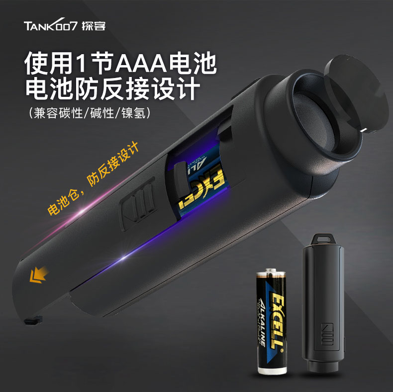 4、使用1節(jié)AAA碳性/堿性電池或1節(jié)AAA可充電鎳氫電池,采用物理防反接的結構,防止電池倒裝對手電筒造成危害;
